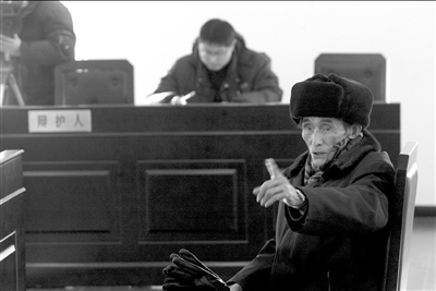 庭審時,99歲老漢周志評被法官特許坐著受審。聽了一會兒后,他放松了下來,一度還蹺起了二郎腿。