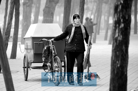 梁廣英說(shuō)的是她的月工資。她在鄭州城西的碧沙崗公園做清潔工,已經(jīng)有兩個(gè)月時(shí)間。不過(guò),她不直接受雇于公園管理處,每月250元的工資,是由公園一名姓趙的清潔工給她開的。她幫他干活。