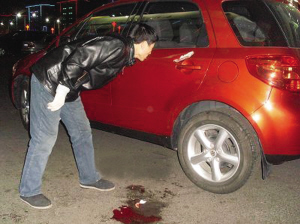 在一知情者的帶領(lǐng)下,記者找到了死者事發(fā)時(shí)乘坐的轎車。這是一輛紅色長安鈴木轎車,車的左側(cè)后座門把手上方,一個(gè)長約10厘米的大口子清晰可見,大口子已透過轎車鋼板,足見當(dāng)時(shí)進(jìn)入車內(nèi)煙花的威力之大。轎車后座的靠背上,還留有一大攤血跡。