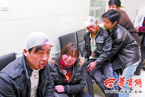在鳳城醫(yī)院急診科,看見丈夫陳國權滿臉血跡,頭裹紗布無力地靠在大廳的椅子上,王克云立即失聲痛哭。陳國權說,頭上剛縫了6針。鐘文榜傷勢更嚴重,滿臉的血跡已凝結,頭裹紗布,左腿已不聽使喚!八麄儍扇舜蛭乙粋!辩娢陌裾f。自己看見打人的頭戴著紅色的安全帽,上面有“中國華西”幾個字。“是我(在外面)報的警,他們看見我報警了,追出來把我一陣亂打!币慌缘耐蹩饲暹呎f邊流淚。