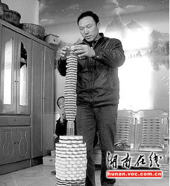 用一個(gè)麻將子頂起26副(2800多個(gè)子)麻將,凈高達(dá)到3米,你見(jiàn)過(guò)嗎?湘潭縣姜畬鎮(zhèn)31歲的彭樹(shù)炎經(jīng)過(guò)8年苦練,練出這樣一手絕活。他盼著能創(chuàng)造一項(xiàng)吉尼斯世界紀(jì)錄。
