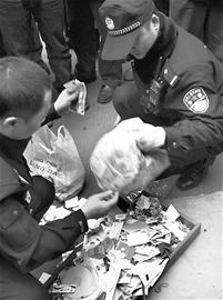 上午10時40分,警方將老人從樓上扔下的錢、名片、光盤等東西一一收拾好帶走,以作進一步調(diào)查。