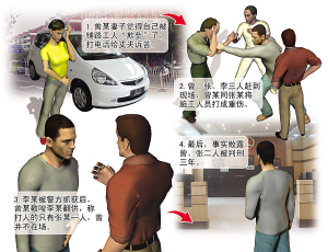 檢察官劉毅稱,當(dāng)時(shí)李某是開車去的,被圍觀群眾記下了車牌號(hào),警方據(jù)此將他抓獲。曾、張二人得知李某被抓,商量由張某獨(dú)自扛下此事,并統(tǒng)一口徑“曾某不在打人現(xiàn)場(chǎng),只有張一人動(dòng)了手。”