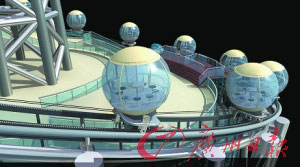 每個(gè)觀光球艙直徑3.2米,可“裝”4~6名乘客;球艙殼體采用新型高分子材料,晶瑩剔透,能保證艙內(nèi)游客對(duì)塔外景色一覽無(wú)余。