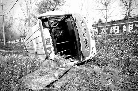 這輛公交車翻倒在路邊一片兩米多深的洼地里(如上圖)。車上35名乘客不同程度受傷,受傷者被送往平頂山市第二人民醫(yī)院搶救,其中兩人比較嚴(yán)重。