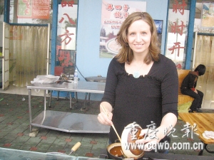 “我先來,是這里的地主!避噭P茜說,開餃子店幾年來,她學(xué)會了怎樣與菜市場的小商小販討價還價,學(xué)會了怎樣招徠顧客。其他老外初入洋人街開店,她主動幫忙,給他們當(dāng)翻譯等。為給新來的老外“扎場子”,她還經(jīng)常組織朋友去照顧生意。