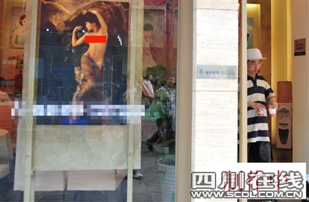 這家攝影店位于春熙路南口,在臨著步行街的一排商鋪中。店門口一扇巨大的落地玻璃櫥窗里,掛著兩幅照片,其中一幅就是侯女士提到的那幅裸照。照片大約有80厘米高、60厘米寬,照片上的長發(fā)女子上半身正面全裸,下半身也只有一層薄紗遮蓋。路過的路人中,有不少人的目光都會在這幅照片上停留。