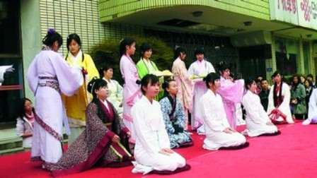 古時(shí)女子在15歲都有成人禮,謂之“笄禮”,是女性一生中最重要的禮節(jié)之一,可與婚禮并重。昨日下午,湖南師范大學(xué)五舍廣場(chǎng)前上演了“時(shí)空錯(cuò)位”的一幕:三名妙齡美眉身著寬袍大袖的漢服,在一大群穿牛仔褲、T恤,手持?jǐn)?shù)碼相機(jī)的大學(xué)生圍觀下,集體接受了成人禮。據(jù)悉,這是湖南首次集體舉辦女子漢服成人禮。
