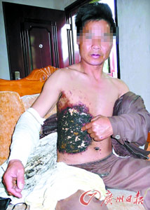 備受社會關(guān)注的手機(jī)爆炸事件再次在韶關(guān)上演。一名乘坐摩托車的男子腰間突然發(fā)生爆炸,被強(qiáng)大的沖力掀倒在地上的他身上燃起了大火還渾然不知發(fā)生了何事,最后才發(fā)現(xiàn)始作俑者原來是自己腰間懸掛的手機(jī)。昨天上午,記者在韶關(guān)市武江區(qū)重陽鎮(zhèn)見到了全身滿是傷痕的機(jī)主林先生。
