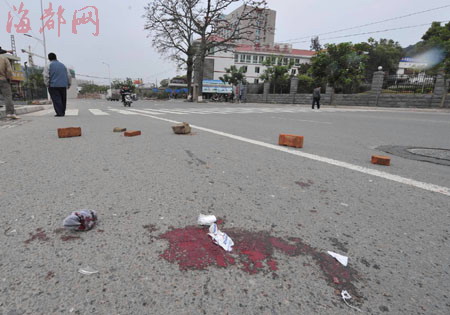 記者趕到現(xiàn)場時,老人剛被送往醫(yī)院,路面上滿是血跡。警方正在用磚頭圍著的事故現(xiàn)場勘查。“當時那名老人從分院走出來,過斑馬線時,一輛摩托車從他后面撞了上去。”一目擊者說,那輛“黑色,很新”的摩托車速度很快,“老人被撞得飛起,在地上滾了幾下,躺在路上呻吟著,頭上、腳上都是血!
