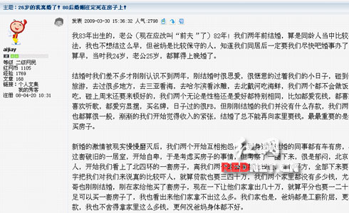 “現(xiàn)在婚姻都得先考慮對(duì)方有沒(méi)有房和車(chē)”,近日,網(wǎng)友“aijiay”在紅網(wǎng)論壇貼出一篇題為《26歲的我離婚了!80后婚姻注定死在房子上》的帖,帖中稱(chēng)83年出生的她兩年前與82年出生的老公在北京租房完婚,后因“身邊的同事有車(chē)有房”而萌生買(mǎi)房念頭,最后卻因手頭拮據(jù)多次發(fā)生爭(zhēng)吵后離婚。此帖短短幾日引來(lái)網(wǎng)友陣陣熱議,支持有贊賞同在,也有人無(wú)奈感嘆。