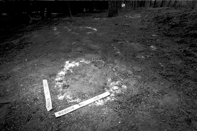 昨天上午在事發(fā)現(xiàn)場(chǎng),警方勘察時(shí)撒的石灰粉清晰可見(jiàn),一些物證袋封存條遺留在地上。在圍墻附近東西走向的灌木叢中,記者看到一處新翻的土堆,土堆上有兩處血跡。