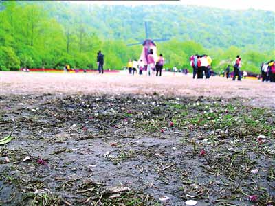 杭州市園林文物局花港管理處辦公室主任馮剛說,按太子灣的規(guī)模,人數(shù)超過1.1萬人次就要啟動(dòng)應(yīng)急預(yù)案,但清明節(jié)3天游客數(shù)量超過20萬人次,70%是外地游客。為防止意外,疏散人群,公園只能把觀賞草坪開放。后果是一半草坪被損,成片草坪被踩成黃泥地,游客為了拍照,踩踏、搖落的觀賞花不計(jì)其數(shù)。