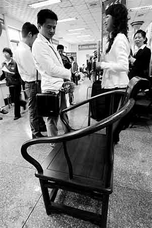昨日,在武昌起點(diǎn)人力資源市場舉辦的湖南商會(huì)專場招聘會(huì)上,一招聘單位將一把新椅子放在招聘展位前,寓意虛位以待、求賢若渴,期待能招到更多的實(shí)用人才。(記者 金思柳 通訊員 孫文茹 攝)(記者 齊翔 實(shí)習(xí)生 孫廣茹 周琴)