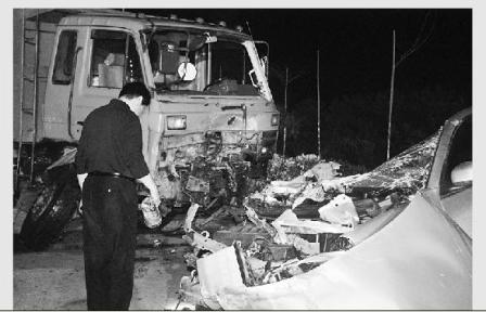 在渣土車前方,車牌號(hào)為閩A6557B的銀灰色尼桑轎車已經(jīng)面目全非,車身已被壓扁,頂蓋被削飛了出去。駕駛室里滿是血跡,旁邊的路面上也到處是血跡和油漬。