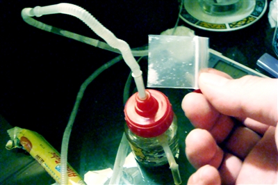 燈一打開,只見茶幾上擺著吃剩的生日蛋糕,3個用來吸食新型毒品的瓶子,臥室桌上也擺著瓶子,散落著大量的塑料吸管。之后,該房間的6男3女全部被帶回分局進(jìn)行尿檢,證明均吸食了麻果。