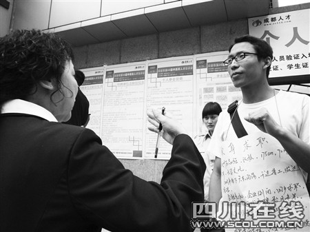 “求職意向不限,只要不違背道德和法律;出讓5年青春,每年年薪10萬。”想要求職,卻又不帶任何相關(guān)證件,只靠胸前掛著的“賣身求職”的告示,出現(xiàn)在招聘會門外,尋求用人單位和他聯(lián)系。昨日,寧夏街中國成都人才市場正舉辦一場人才招聘會,而招聘會大門外,一名胸前掛著“賣身求職”告示的年輕人,卻引來周圍群眾紛紛駐足。對于年輕人這種行為,用人單位看法不一。