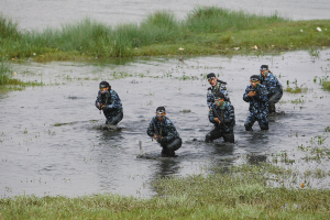 3月8日,15名突擊隊(duì)員從?趤(lái)到湛江,被分成三個(gè)班。次日凌晨4時(shí),天降暴雨,旅途勞頓的特警隊(duì)員們?nèi)栽诔脸恋乃瘔?mèng)中。突然,緊急集合的哨音響起,隊(duì)員們從睡夢(mèng)中跳起,打好背包沖出門(mén)外。8.9公里的拉練,泥濘的路,讓剛到受訓(xùn)地的隊(duì)員們還不適應(yīng)。行進(jìn)過(guò)程中,有掉隊(duì)的、有體力不支的,隊(duì)友們相互攙扶,相互鼓勵(lì),才成功地完成了他們受訓(xùn)的第一課。