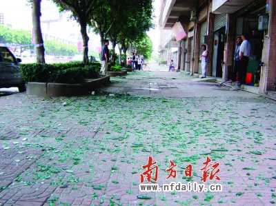 昨日,記者再次來(lái)到事發(fā)地看到,警方仍未解除警戒線,幾名民警在現(xiàn)場(chǎng)緊張勘察。事發(fā)街道兩旁的玻璃碎片仍是灑落一地,離爆炸核心位置20多米遠(yuǎn)的一家修理店老板介紹,很多玻璃碎片都是從對(duì)面街道飛過(guò)來(lái)的,他指著一塊插入卷閘門(mén)的石頭說(shuō):“這個(gè)也是從對(duì)面飛過(guò)來(lái)的,當(dāng)時(shí)爆炸的威力太可怕了!