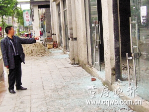 昨日下午,記者在現(xiàn)場看到,A1-14、15號門面各有一扇鋼化玻璃門受損,16號門面有兩扇玻璃門被毀,而14號門面上的二樓房間,也有一塊玻璃破碎。