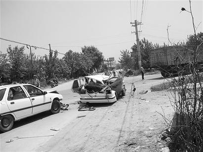 據(jù)附近廢品收購點的一位目擊者稱,昨日上午10點55分,106國道新(洲)徐(古)公路交叉處,一輛白色捷達小轎車沿新徐公路自東向西疾馳,與沿106國道由北而南駛來的一輛重型自卸貨車相撞。轎車右后側被撞后發(fā)生180度大旋轉,隨后又撞到路邊一輛停著的小車方才停下。據(jù)悉,捷達小轎車上有四男一女,司機鄭某受傷,兩男當場身亡,另一男一女被送往醫(yī)院,其中男子在送醫(yī)途中死亡。