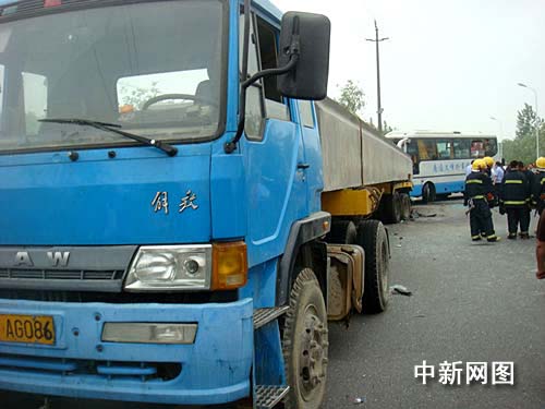 當(dāng)日上午,當(dāng)?shù)鼐浇拥綀?bào)警,稱兩車發(fā)生相撞,有重傷員被困,情況危急。接警后,當(dāng)?shù)囟嗝拦俦徒谎簿⒓蹿s到現(xiàn)場(chǎng)。此時(shí),救援人員發(fā)現(xiàn)一輛牌照為蘇FAG開頭的裝載著兩根橋梁大梁的超大型解放拖掛平板車與一輛南通牌照的大客車撞在一起,平板車上一根橋梁大梁直插入客運(yùn)車右側(cè)三分之二處,車上有五人被嚴(yán)重變形的座椅困在車廂內(nèi),身受重傷。