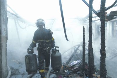 幾分鐘后,硚口、漢正街消防中隊(duì)11輛消防車相繼趕到現(xiàn)場(chǎng)。此時(shí),5樓已是一片火海,濃煙滾滾。幾名消防官兵立即沖向樓內(nèi),疏散群眾。消防官兵在四樓搜救到一名被困太婆,救到一樓安全地帶。隨后在消防官兵20多分鐘的強(qiáng)攻近戰(zhàn)撲救下,大火被撲滅,7間簡(jiǎn)易房被燒光,無人員傷亡。