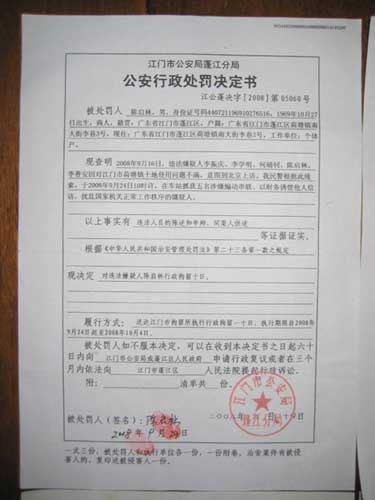 但是,對于江門日報刊登的報道,一名網(wǎng)友給本網(wǎng)提供了《行政處罰決定書》的圖片,在該圖片上可以清楚地看到,決定書上寫著“現(xiàn)查明2008年9月16日,違法嫌疑人……因?qū)T市荷塘鎮(zhèn)土地使用問題不滿,意圖到北京上訪。我民警根據(jù)此線索,于2008年9月24日10時許,在車站抓獲五名涉嫌煽動串聯(lián)、以財務(wù)誘使他人信訪,擾亂國家機(jī)關(guān)正常工作秩序的嫌疑人”,在決定書下方有被處罰人簽名和指模,以及江門市公安局蓬江分局蓋印。該名網(wǎng)友同時提出質(zhì)疑,聲明摘錄如下: