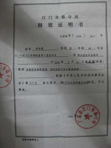 事實(shí)上,蓬江區(qū)公安分局2008年9月24日就以“擾亂社會管理秩序”為名對7人進(jìn)行了行政拘留,相應(yīng)的行政處罰決定書稱:“我民警于2008年9月24日10時許,在車站抓獲五名涉嫌煽動串聯(lián)、以財物誘使他人信訪,擾亂國家機(jī)關(guān)正常工作秩序的嫌疑人。”