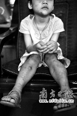 “身上還疼”,心怡見到記者時說。昨日下午,記者在廣州市花都區(qū)政府附近某幼兒園見到了她。其臉上有7處長短不一的傷痕,腦門上的一處還出血,下巴處硬幣大小的瘀傷分外明顯,“這是媽媽拉我,我倒在地上時摔的”。她的兩條胳膊同樣是傷痕累累,右手腕腫脹變形,腿和腳上傷痕密集,右腿上一處約2厘米長的傷痕已經(jīng)淤血化膿。當(dāng)幼兒園老師掀起心怡的衣服時,其背部、臀部成片的紅色條狀傷痕顯露出現(xiàn)。有的傷痕明顯是不同時間毆打,舊傷未愈又添新痕。記者粗略計算,外傷不止70處。