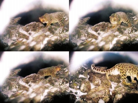 “從照片看,這些雪豹應該至少是兩只!迸P龍?zhí)貏e行政區(qū)資源管理局副局長徐海斌特別興奮,據他說,從照片上看,拍攝的應是成年雪豹,且體型健美,毛色發(fā)亮,做掌握方向“舵”的尾巴靈敏,特別是眼睛兇猛異常,證明其身體健康狀況十分不錯。據了解,今年臥龍同北京大學合作的監(jiān)測項目中,他們首次在海拔4400米以上安裝了兩臺700萬像素的紅外線相機,也是專門加強對雪豹等珍稀野生大型肉食性動物的專項監(jiān)測,沒想到未滿半年就有了收獲。