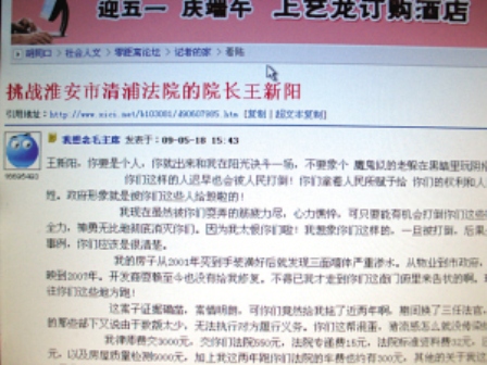 淮安市民曹先生在打官司勝訴后,卻遭遇執(zhí)行難的問題。于是他一氣之下在網(wǎng)上發(fā)帖,將自己從打官司到執(zhí)行遇到的難題公布在網(wǎng)上,并向?qū)徖碓摪傅幕窗彩星迤謪^(qū)法院王新陽院長公開挑戰(zhàn),要求院長出面對話。誰料想該帖一經(jīng)發(fā)出立即引起網(wǎng)友關(guān)注,國內(nèi)一些網(wǎng)站也紛紛轉(zhuǎn)載。一時間,他本人與王新陽都被推至輿論的風(fēng)口浪尖。昨天,曹先生在電話里告訴記者:“事與愿違,現(xiàn)在事情發(fā)展到我自己也控制不住的地步”,而王院長在接受記者采訪時表示,他可以理解曹先生發(fā)帖時的心情。
