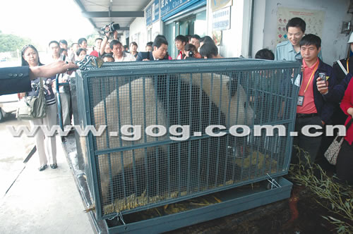 “大熊貓出來(lái)了!”載著樂(lè)水的推車剛一出現(xiàn)在貨運(yùn)部門口,立即被人們包圍。熱情的市民紛紛拿出手機(jī)或相機(jī)給樂(lè)水照相,剛下飛機(jī)的樂(lè)水低著頭,誰(shuí)也不理會(huì)。經(jīng)24日先期抵達(dá)貴陽(yáng)的檢查扎佐野生動(dòng)物園大熊貓館的成都熊貓基地專家、高級(jí)畜牧師吳孔菊和飼養(yǎng)員陳敏觀察,第一次乘坐飛機(jī)的樂(lè)水和珠珠沒(méi)有暈機(jī)現(xiàn)象,除稍顯有些緊張外,總體良好。