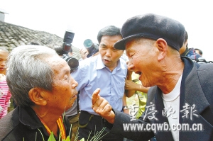“劉東娃(劉召回的小名),讓我摸摸你頭頂?shù)膫,好沒有?”只見一位年齡相仿的老人擠進人群,將雙手罩向了劉的后腦,撥開層層白發(fā),撫摸著一道一寸來長的疤痕驚喜地說,“沒錯,就是東娃!你頭上這道傷疤,是我們一起下河摸魚時摔傷的,你還記得不?”