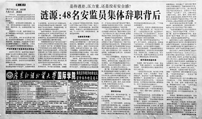 5月22日,湖南省《湘聲報》刊登《湖南漣源48名安監(jiān)員集體辭職 待遇不如礦工》。3天后,《中國青年報》刊發(fā)《漣源:48名安監(jiān)員集體辭職背后》。兩篇報道如投放在輿論渦流中的重磅炸彈,一時間,網(wǎng)絡上的相關評論鋪天蓋地,傳統(tǒng)媒體也迅速跟進,輿論沸騰了。