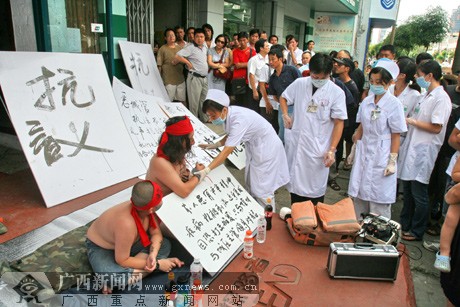 6月16日下午4時(shí)許,網(wǎng)友“馬甲00007”在廣西新聞網(wǎng)紅豆社區(qū)上發(fā)了題為“猛報(bào):赤膊靜坐抗議城管(多圖)”的帖子,引起眾多網(wǎng)友的關(guān)注。記者在第一時(shí)間趕到南寧市思賢路的一家戶外用品店鋪。