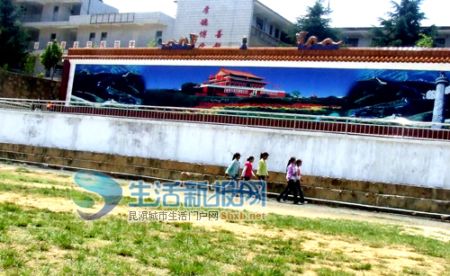 6月16日14時許,記者來到離曲靖市區(qū)約10公里的寥廓街道中學。足球場旁,一堵長約400多米,高約2米的圍墻異常醒目,面對教學樓的那一段圍墻,卻突然高出了一截。墻頭鑲嵌有黃色琉璃瓦,上面屹立著有藍黃琉璃瓦做成的兩龍戲珠,而墻壁中間則是一幅北京天安門城樓油畫。