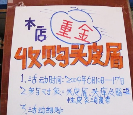 在朝聞網(wǎng)、搜狐社區(qū)、新浪論壇上,一篇名為《暴強!藥店竟然收購頭皮屑》的帖子,引發(fā)網(wǎng)友熱議。帖中說,自己在經(jīng)過住地附近的一家藥店時看到,店門口竟貼出一張海報要收購頭屑!這可怎么算,按斤稱?論兩算?不是,是以片兒算,店方開出了每片頭屑100元的天價。樓主驚嘆,見過收廢品收古董啥的,“這回我真是被雷著了!我看這藥店老板肯定是個腦殘,還不如直接送錢好了……”