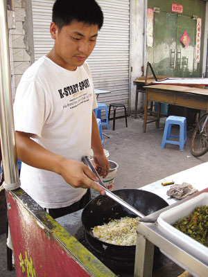 鮑斌是揚大體育學(xué)院03級學(xué)生,因為家庭經(jīng)濟困難,讀大三的時候,小鮑決定休學(xué)創(chuàng)業(yè),選擇的創(chuàng)業(yè)項目是再普通不過的蛋炒飯。他沒有向父母透露半點風(fēng)聲。在外面租了一間房子,開始了創(chuàng)業(yè)歷程。開始,小鮑的生意不是很景氣,后來,大伙對他的手藝認(rèn)可后,生意便開始紅火起來。“我每天準(zhǔn)備的炒飯都會比別人賣得快,所以經(jīng)常早收攤,算下來,平均一天能賣幾百盒。”鮑斌一臉興奮地告訴記者,刨去成本、平常的開銷,每年掙10萬元非常輕松。因為生意越來越火,他給淮安老家的父親打了個電話,請二老過來幫忙。從此兩個老人正式給兒子打起“下手”來。