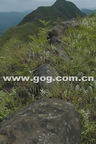 登上山頂后,楊海發(fā)現(xiàn),蜂糖梁子的主峰頂是一片植被覆蓋的平地。在峰頂以下近兩米處的草叢中,他發(fā)現(xiàn)了一排經(jīng)過(guò)人工開(kāi)鑿并打磨過(guò)的方形巨石,它們依次面向南面排列著,這些巨石色澤不同于呈青灰色天然巖石,全部呈褐紅色,且每一塊巨石的重量大約都在數(shù)噸以上。在主峰與東邊第一座山峰相連接處的草叢中,還有兩段保存較為完整的石墻,石墻沿著山崖呈弧形分兩層躍式向主峰包圍,每一層所圈面積大約都在十幾個(gè)平方米以上。