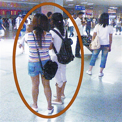 7月2日早晨6時(shí)許,記者再次來到出站口,不到十分鐘發(fā)現(xiàn)“目標(biāo)”:一個(gè)穿吊帶衫、熱褲的女孩。她皮膚白凈,又高又瘦,挎單肩藍(lán)色包,略施脂粉。不同于其他接站市民的是,她不看出站人群,不關(guān)注到站時(shí)間,只尋找人群中的中青年男子,主動(dòng)上前攀談。