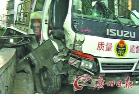 記者在現(xiàn)場(chǎng)看到,一輛車頭標(biāo)有“質(zhì)量監(jiān)督”字樣的五十鈴汽車斜靠在路邊護(hù)沿,車頭底盤(pán)受損嚴(yán)重,右側(cè)車門撞車后脫落路邊。距五十鈴十米遠(yuǎn)處,五輛停在路邊的面包車和轎車尾部被撞凹陷。