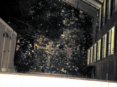 “還把寢室的桌椅也扔了下去!”“扁殼陽”說,他們甚至將放在樓道里的垃圾桶、地板磚也全部砸了下去。“熱水房的頂棚都被砸壞了!薄氨鈿り枴狈Q,“畢業(yè)扔”在他們宿舍樓就持續(xù)了兩三天。