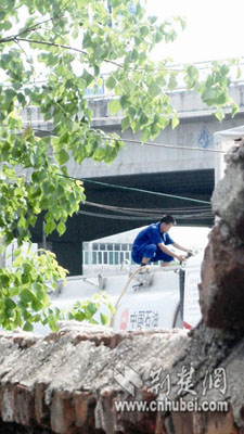停車場(chǎng)的上面就是鄂黃大橋,記者繞行來到橋上面。剛找準(zhǔn)位置停下,就看見一輛車身上印有“中國(guó)石油”的油罐車駛?cè)胪\噲?chǎng)。約5分鐘后,一名光著上身的男子開著三輪車駛?cè),車上裝著幾個(gè)大的空塑料油桶和一根塑料油管。油車司機(jī)迎了上去,并把三輪車停在油車的一側(cè)。約十分鐘后,三輪車駛出停車場(chǎng),塑料桶內(nèi)已裝滿汽油。