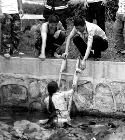 女子把放在水里的衣服重新穿上,在消防隊員的協(xié)助下爬了上來。她在上岸之前,還順便從河中摘了一朵蓮花獻(xiàn)給警察,以示“感謝”(右)。