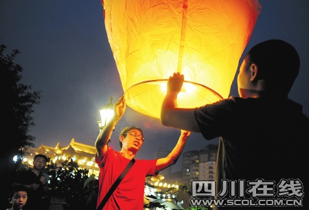 晚8點(diǎn),合江亭邊天色還未全暗,“范跑跑”身著紅色T恤、休閑短褲和一群藝術(shù)家安靜地坐在竹椅上等候。8點(diǎn)30分左右,德籍華人藝術(shù)家蔡青招呼眾人,《祈愿》正式開始,范跑跑徑直走向安放孔明燈的紙箱旁!拔覀兊目酌鳠羰菑呐_北郵購過來的。除了要用孔明燈為地震逝者祈愿,還寓意海峽兩岸人對生命的尊敬。下面我和范老師將共同放飛孔明燈,愿意參與的市民都可以加入!辈糖嗍谴舜位顒拥闹饕l(fā)起人,作為常年旅居國外的德籍華人藝術(shù)家,蔡青說多次前往映秀、北川等災(zāi)區(qū),大片廢墟令他很震驚。蔡青點(diǎn)燃孔明燈后,邀請“范跑跑”和他共同扶住燈的底框,將高達(dá)1米左右的孔明燈逐個放飛。