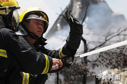 在整個火災(zāi)現(xiàn)場,消防戰(zhàn)士手中的水槍有遠(yuǎn)攻,也有近距離疾射。大致目測一下,最近的消防戰(zhàn)士距離火源不到兩米遠(yuǎn)。熊熊燃燒的烈火輻射出的溫度可達(dá)七八十度,在高溫的熏烤下,參加滅火的消防官兵面孔紅通通,汗水匯成了一道道水線,不斷的往下流。