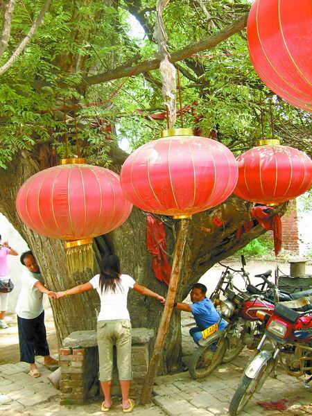 “這棵樹可有年頭!”村民楊更偉說,這棵大槐樹已有一千多年的歷史,樹干周長(zhǎng)將近5米,5個(gè)成年人才能把這棵大槐樹環(huán)抱住(如圖),偶爾會(huì)有人在樹下燒香,樹洞里布滿了蜘蛛網(wǎng),一直沒人管理。