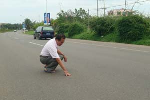 7月28日上午,麥文金帶領(lǐng)記者來到兒子麥文鋒被撞和被埋的地方。站在兒子被車撞的地方,麥文金努力尋找去年留下的血跡,可是已經(jīng)什么都找不到了。附近一位賣冷飲的人說:“老麥已經(jīng)來過很多次了,每次都這么找!