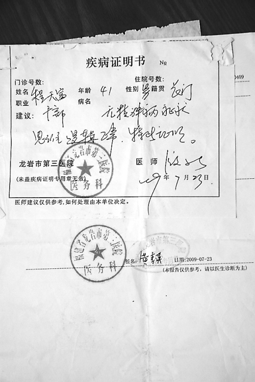 2009年7月18日,程天富從精神病院第四次出來(lái),擔(dān)心呆在長(zhǎng)汀還有被抓進(jìn)精神病院的危險(xiǎn),但又無(wú)法證明自己沒有精神病,遂到龍巖的醫(yī)院就診。